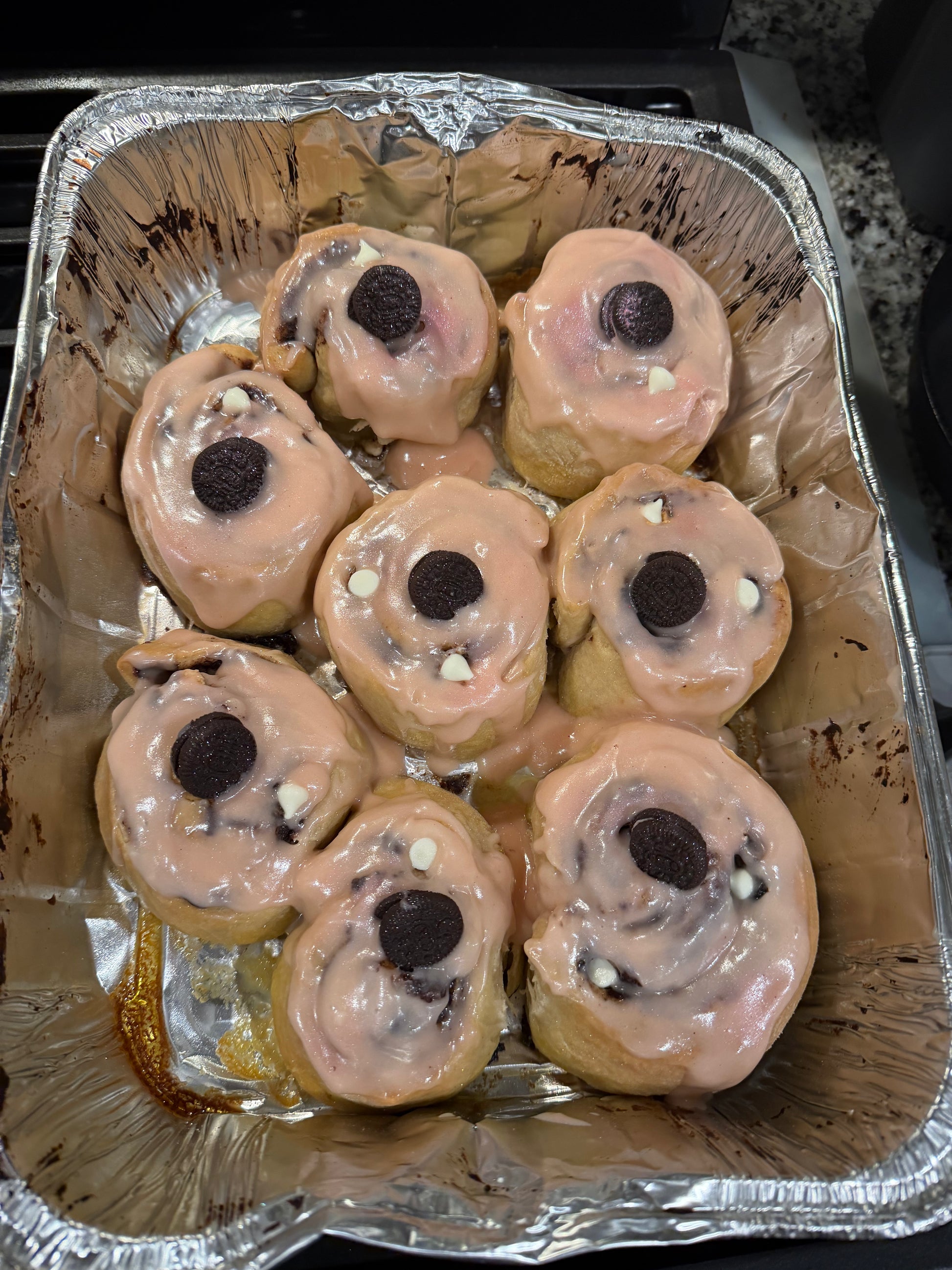 Our Cookies & Cream Cinnamon Rolls are a decadent twist on a beloved classic. Made with our soft, buttery dough and layered with cinnamon filling, each roll is infused with crushed chocolate sandwhich cookies throughout the swirl. Baked to golden perfection and finished with a smooth cram glaze and additional cookie crumble,this flavr offeres a rich, velvety texture with the perfect balance of chococolate and sweetness. Bold yet balanced, and carefully handcrafted on small batches to ensure consistency and premium quality.